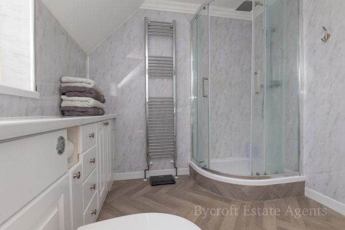 SHOWER ROOM 10' 3" x 7' 5" (3.12m x 2.26m) fitted with a shower suite comprising vanity hand wash basin with built in storage units; low level wc; corner quadrant shower cubicle; sliding shower screen doors; wall mounted shower unit with hand and soaker attachments; double glazed window to rear; shaver point; heated towel rail radiator.