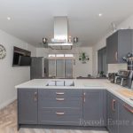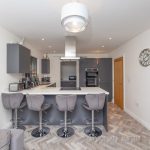 KITCHEN/DINER 17' 11" x 11' 4" (5.46m x 3.45m) large L-shaped worktop/breakfast bar; range of base cupboards and drawers under; including integrated dish washer and drawers; one and a half bowl sink with mixer tap; four ring induction hob; further units including integrated fridge freezer; eye level oven and grill; wall units; light and extractor; space for American style fridge freezer; two side windows; radiator; down lights; opening to: