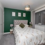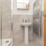 ENSUITE SHOWER wc; shower cubicle with mains fittings; pedestal wash hand basin with mixer tap; frosted double glazed window; heated towel rail; down lights.