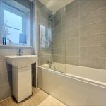 FAMILY BATHROOM 6' 1" x 7' 1" (1.85m x 2.16m) fitted with a white suite comprising a low level wc; vanity hand wash basin with mixer tap and storage cupboard below; panel bath with shower mixer over and wall mounted electric shower unit; fully tiled walls; extractor fan; upvc double glazed window to front; heated towel rail radiator.