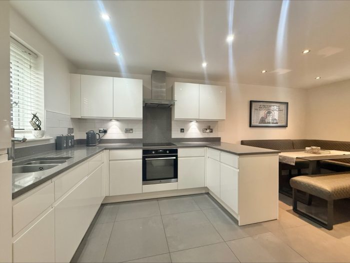 KITCHEN DINER 18' 5" x 9' 3" (5.61m x 2.82m) fitted with a range of wall and base units with square edge quartz work surfaces over; inset 1½ bowl sink with mixer tap over; integrated fridge, freezer and dishwasher; built in electric oven; inset 4 ring induction hob with cooker hood over; quartz, tiled splashback and upstand; upvc double glazed window to rear; Peninsula dining area with upvc double glazed window to front and rear.