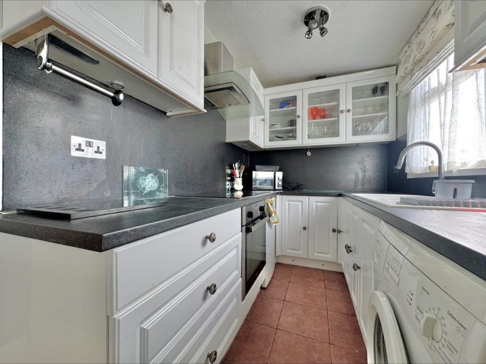 KITCHEN 8' 5" x 6' (2.57m x 1.83m) upvc double glazed window to the front aspect; fitted with a range of wall and base units; integrated sink drainer; integrated hob and oven; space for other white goods.