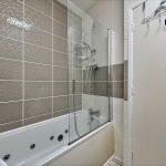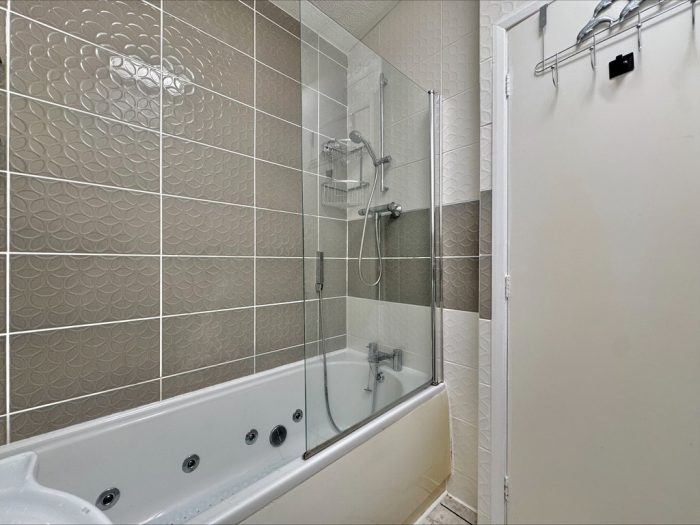 BATHROOM jacuzzi bath with mixer taps and shower attachment; heated towel rail; wc; hand wash basin.