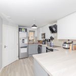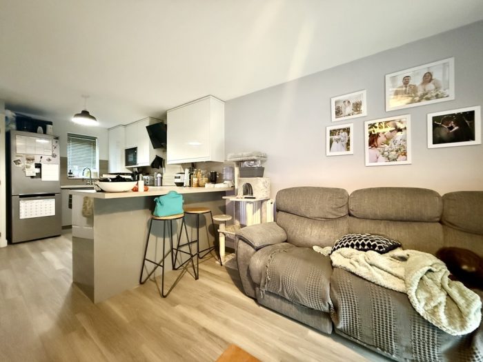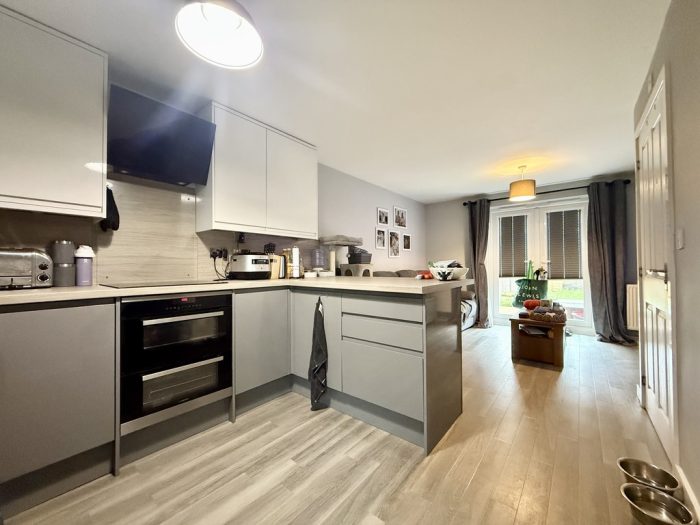 KITCHEN/LOUNGE/DINER 22' 1" max x 12' 2" (6.73m x 3.71m) u-shaped worktop/breakfast bar; range of base cupboards and drawers under; including integrated dish washer; built in oven and grill; space and plumbing for washing machine; space for upright fridge freezer; four ring hob; one bowl sink with mixer tap; range of wall units with built in microwave; extractor fan; window to front aspect; french doors to rear garden; two radiators; under stairs storage space.