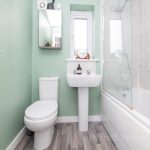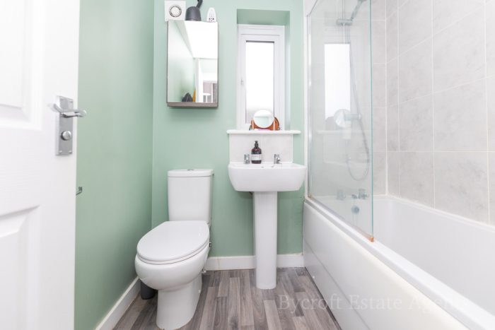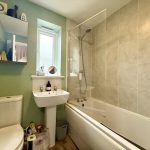 BATHROOM wc; pedestal wash hand basin; bath with shower and shower screen; frosted double glazed window; heated towel rail.
