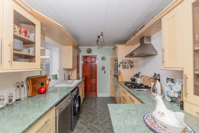 KITCHEN 15' 4" x 7' 11" (4.67m x 2.41m) UPVC double-glazed window to side aspect; fitted kitchen with mixture of wall and base units; integrated sink drainer; integrated oven, microwave and gas hob with extractor fan; space for other white goods; under stairs cupboard; UPVC double-glazed double-doors leading to: