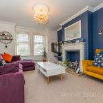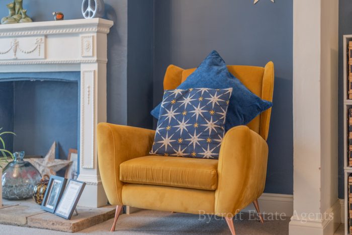 SITTING ROOM 25' 11 max into bay" x 12' 5 max" (7.9m x 3.78m) UPVC double-glazed window to front; feature fireplace with decorative surround and pamment tiled hearth; under stairs storage cupboard.