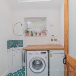 UTILITY/CLOAKROOM 6' 2" x 5' 11" (1.88m x 1.8m) fitted with a low level WC, corner vanity hand wash basin with mixer tap over and storage cupboards below; tiled splashback; base units with plumbing for automatic washing machine and floor mounted oil-fired central heating boiler; Velux roof light window; UPVC double-glazed window to rear.