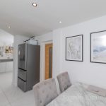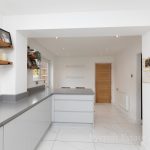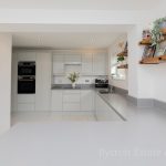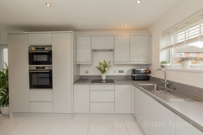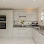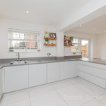KITCHEN DINER 18' 3 max" x 10' 1 max" (5.56m x 3.07m) fitted with a modern range of wall and base units with square edge work surfaces over; inset 4 ring induction hob with cooker hood over; inset stainless single drainer sink with hot water Qettle tap over; space for fridge freezer; built-in combination ovens; integrated dishwasher and bin drawer; upstand over the work surfaces; UPVC double-glazed windows to front and door to front; peninsula breakfast bar; tiled flooring.