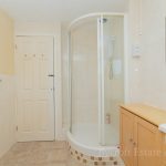 BATHROOM 9' 3" x 6' 5" (2.82m x 1.96m) fitted with white suite comprising of a corner quadrant shower cubicle with sliding shower screen doors, wall mounted electric shower unit, vanity hand wash basin with mixer tap over and storage cupboards below, low level wc; built-in cupboards; tiled splashbacks; shaver point; UPVC double-glazed window to front.