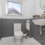 CLOAKROOM 5' 1 max" x 5' 4 max" (1.55m x 1.63m) fitted with a white suite comprising of a low level WC, wall mounted hand wash basin with mixer tap over; panelled walls; UPVC double-glazed window to front