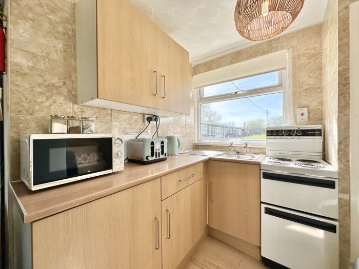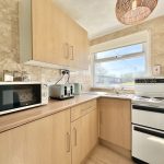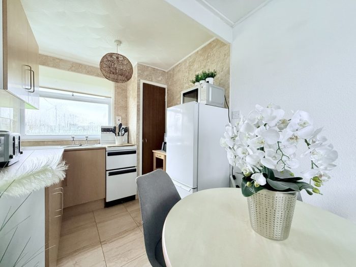 KITCHEN 6' 3" x 6' 9" (1.91m x 2.06m) fitted with a range of wall and base units with roll edge worksurfaces over; inset stainless steel single drainer sink with mixer tap; tiled splashbacks; space for electric oven and fridge freezer; built in tall cupboard with utilities; UPVC double glazed window to rear.
