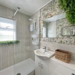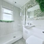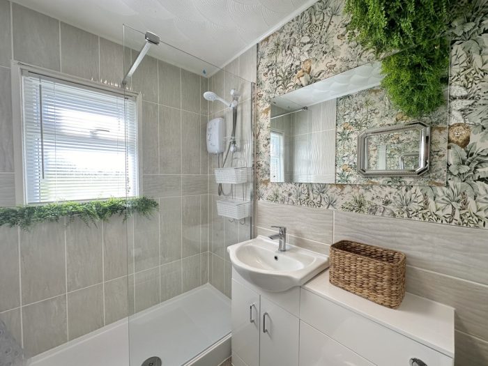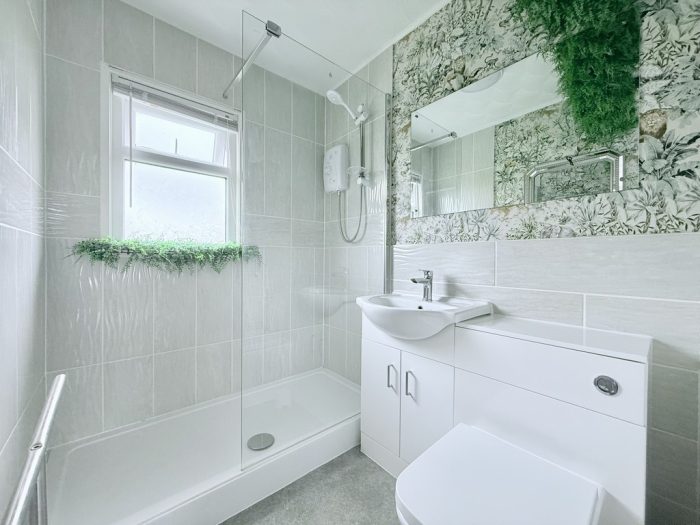 SHOWER ROOM 6' 1" x 5' 0" (1.85m x 1.52m) fitted with a modern white suite comprising of a vanity wash hand basin with mixer tap and storage cupboard; low level wc; walk in shower cubicle with screen and wall mounted electric shower unit; tiled splashbacks; UPVC double glazed window to rear.