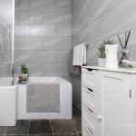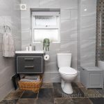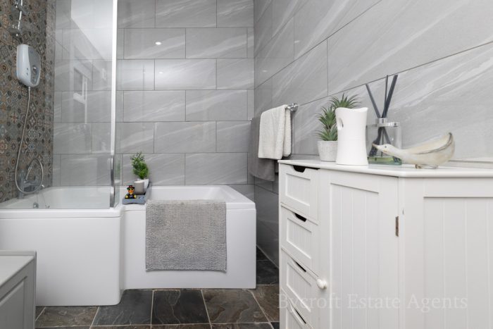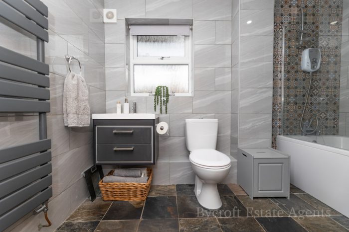 BATHROOM recently installed with modern suite comprising vanity unit with wash hand basin with mixer tap and storage drawers under; wc with push button cistern; shower bath with shower screen mixer tap with Triton electric shower fittings; fully tiled walls and floor; frosted double glazed window; heated towel rail; extractor fan.