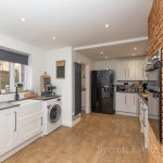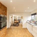 KITCHEN 16' 9 max" x 11 max' (5.11m x 3.35m) fitted with a range of base and wall units with square edge work tops over; inset Belfast style sink with mixer tap over; plumbing for automatic washing machine; space for tumble dryer; integrated bin drawer; built-in double oven in decorative brick housing; inset 4 ring electric hob with cooker hood over; built-in wine fridge; space for American style fridge freezer; modern vertical style radiator; two UPVC double-glazed windows to rear.