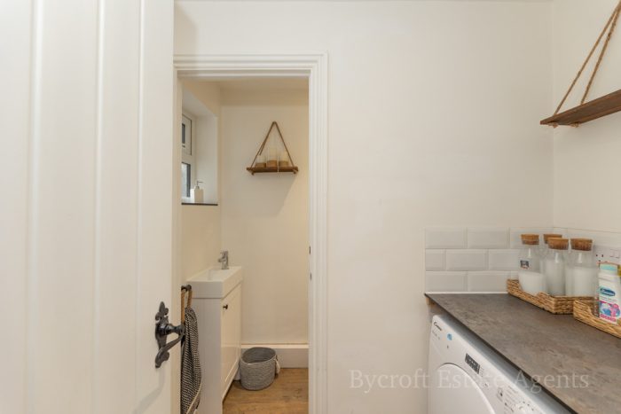 UTILITY ROOM 3' 9" x 6' 4" (1.14m x 1.93m) built-in base cupboard with square edge work surface over; tiled splashbacks; space for tumble dryer.