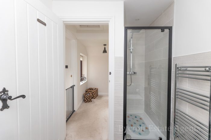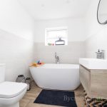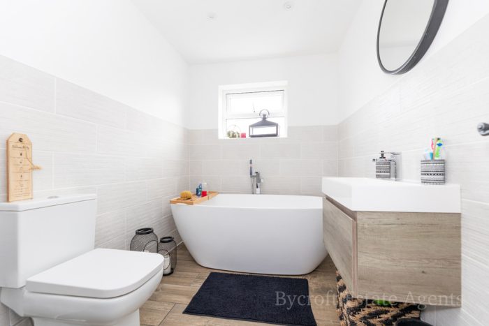 BATHROOM 11' 11 max insto shower cubicle" x 6' 2 max" (3.63m x 1.88m) fitted with a floating vanity hand wash basin with waterfall tap over and storage drawer below; oval shaped free standing bath with waterfall tap and hand shower attachment; low level WC; walk-in shower cubicle with tiled splashbacks, wall mounted shower unit with hand and soak attachments; UPVC double-glazed window to side, heated towel rail radiator.