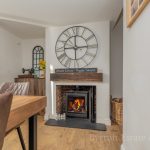DINING ROOM 12' 7 max" x 7' 10" (3.84m x 2.39m) two UPVC double-glazed windows to front; feature fireplace with inset wood burning stove; tiled hearth and decorative timber beam; under stairs storage area.