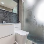 BATHROOM 6' 7 max" x 5' 11 max" (2.01m x 1.8m) fitted with a white suite comprising of a vanity wash hand basin with mixer tap over and storage drawers below; low level wc; walk-in shower cubicle with frosted shower screen, wall mounted shower unit, hand and soaker attachments; storage shelf; UPVC double-glazed window to rear; fully tiled walls; heated towel rail radiator.