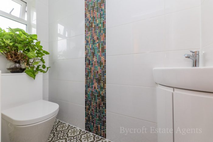 CLOAKROOM 6' 7" x 3' (2.01m x 0.91m) fitted with white suite comprising of a low level wc; corner vanity hand wash basin with mixer tap over and storage cupboards below; fully tiled walls; UPVC double-glazed window to front.