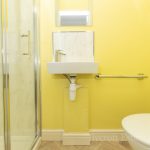 EN-SUITE SHOWER ROOM 7' 3" x 2' 11" (2.21m x 0.89m) low level WC; wall mounted hand wash basin with tiled splashback; walk-in shower cubicle with bi-folding shower screen door; wall mounted shower unit with hand and soaker attachments.