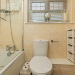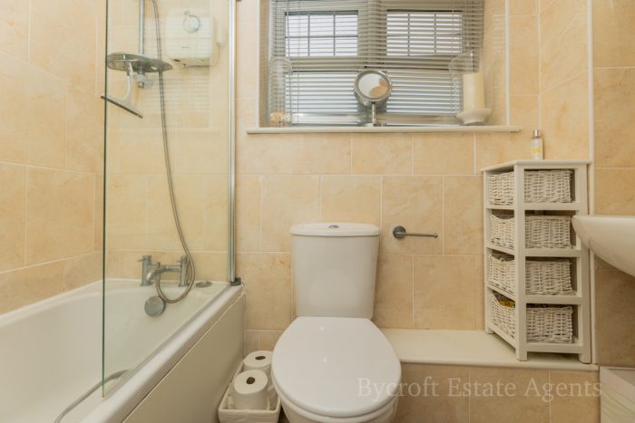 BATHROOM bath with mixer tap, shower attachment and shower screen; wc; pedestal wash hand basin with mixer tap; fully tiled walls; chrome heated towel rail; frosted double glazed window.