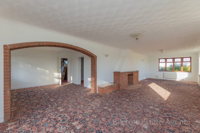LOUNGE 35' 11 max" x 24' 4 max narrowing to 11'10"" (10.95m x 7.42m) large L -shaped room; window to front aspect; sliding patio doors to the front; two side windows; rear window enjoying field views beyond; brick fireplace with quarry tiled hearth; two radiators; wall lights; sliding door to: