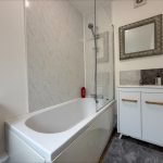 BATHROOM vanity unit with wash hand basin and storage cupboard under; bath with mixer tap and shower attachment; wc; frosted window; chrome heated towel rail; extractor fan.