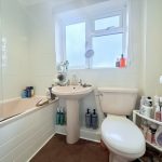 BATHROOM WC; pedestal wash hand basin; bath; mains shower fittings, shower screen; tiled flooring; frosted double-glazed window; radiator.