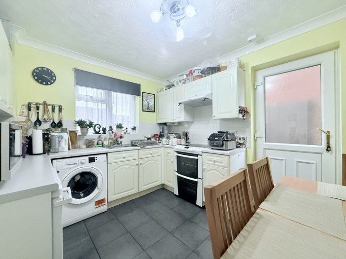 KITCHEN DINER 11' 8" x 9' 4" (3.56m x 2.84m) U-shaped work top, range of base, cupboards and drawers; space and plumbing for washing machine, oven and fridge; stainless steel 1 bowl sink mixer tap; range of wall units, light and extractor; Worcester gas boiler; window to front aspect; radiator; side door; tiled flooring.