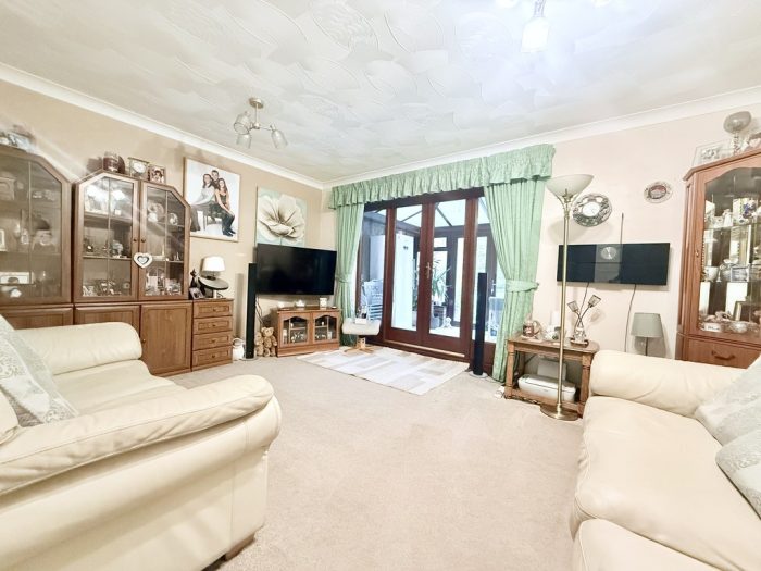 OUTSIDE To the front is a landscaped garden, pathway to canopied front entrance, side driveway with double gates to further secured parking leading to former garage, door providing useful storage space. The garage is currently divided into front storage space and useful office/playroom with access off Conservatory. To the rear is an enclosed, landscaped garden with paved patio and pathways; lawn area, shrubs and plants, timber storage shed.