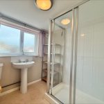 SHOWER ROOM 6' 4" x 6' 10" (1.93m x 2.08m) fitted with a white suite comprising of a low level WC; pedestal wash hand basin; walk-in shower cubicle; sliding shower screen door; wall mounted shower unit; extractor fan; tiled splashbacks; UPVC double-glazed window to front.