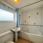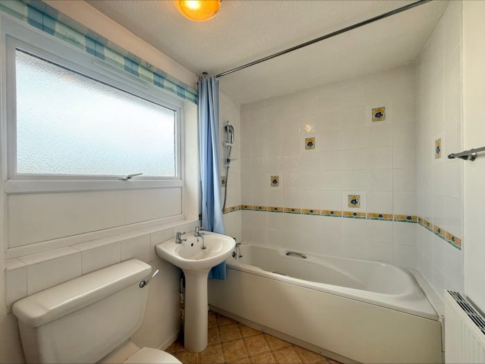 BATHROOM 9' 9" x 5' 8 max" (2.97m x 1.73m) fitted with a white suite comprising of low level WC; pedestal wash hand basin; panel bath, wall mounted electric shower unit over; tiled splashbacks; extractor fan; UPVC double-glazed window to front.