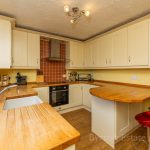KITCHEN 12' 6" x 9' 6" (3.81m x 2.9m) fitted with a range of wall and base units with solid wood work surfaces over; inset Belfast style sink with mixer tap over; integrated freezer,45cm dishwasher and fridge; Peninsula breakfast bar; built-in electric oven; inset 4 ring electric hob with cooker hood over; tiled splashback; UPVC double-glazed window to rear; UPVC stable door to rear.