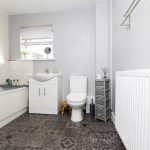 BATHROOM 8' 4 max " x 8' 1 max" (2.54m x 2.46m) fitted with a white suite comprising of a low level wc; vanity wash hand basin with mixer tap over and storage cupboards below; double ended panel bath with mixer tap and wall mounted shower unit over; aqua board splashbacks, shower screen; UPVC double-glazed window to rear; built-in airing cupboard.