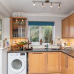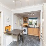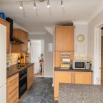 KITCHEN 19' 5" x 8' 2 max" (5.92m x 2.49m) fitted with a range of wall and base units with roll edge work surfaces over; inset stainless steel single drainer twin bowl corner sink units with directional mixer tap over; plumbing for automatic washing machine; integrated dishwasher; space for fridge freezer; built-in double electric oven; inset electric hob with cooker hood over; tiled splashbacks; UPVC double-glazed window to rear; UPVC double-glazed window to Conservatory; under stairs storage cupboard. Door to: