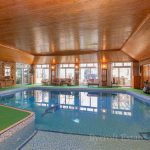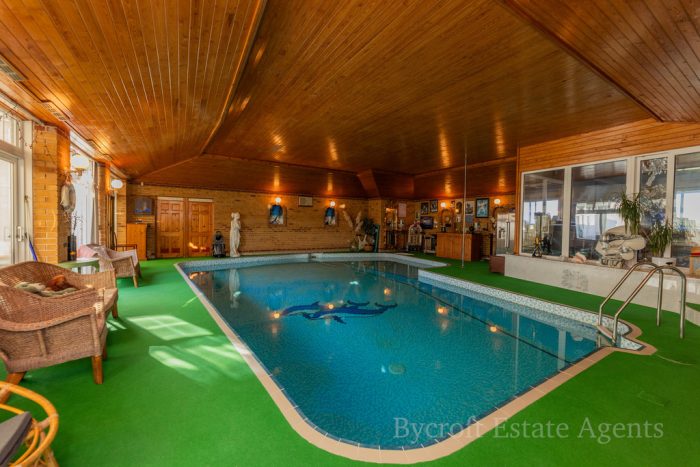 SWIMMING POOL COMPLEX 40' 3" x 38' 0" (12.27m x 11.58m) main swimming pool complex with pine clad semi vaulted ceiling; seven wall lights; steps up to sliding patio doors to the dining room and access to the heated swimming pool which measures approximately 32ft x 18ft with a maximum depth of 2m. There is access off the swimming pool into a changing room with low level WC and adjacent shower room which is tiled and has an electric shower fitting and extractor fan. On the rear of the swimming pool area there is a useful large conservatory and garden room.