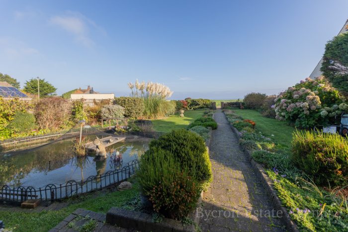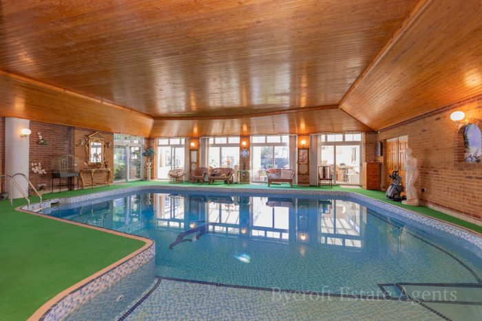 OUTSIDE The property sits on a good size plot which offers a high degree of privacy and security with a video link entry system with wooden double electronically operated gates providing access to a good sized parking area with sensor operated floodlighting and access to the brick built DOUBLE GARAGE 20'6"x 18'2" with electric up and over door, power and lighting, personal door to the rear. There is a gated access leading to the rear garden which offers an exclusive south facing aspect and is laid to lawn with established side borders, corner pagoda and SUMMERHOUSE. Productive vegetable plot and various fruit trees. There is a large paved sun patio. Outside tap. To the side of the property is a PUMP HOUSE housing the solar panel controls, swimming pool pump and oil fired condensing boiler for domestic hot water and central heating which heats the property and adapts to heat the swimming pool. In addition there is an air source heat pump system which assists the heating of the swimming pool. There is also space and plumbing for an automatic washing machine in the pump house. To the front of the property is a further established well stocked garden with lawns, shrub and flower borders. Large nature pond with established plants and pump/fountain. From the front garden there are extensive sea views across the Esplanade and sea beyond.