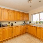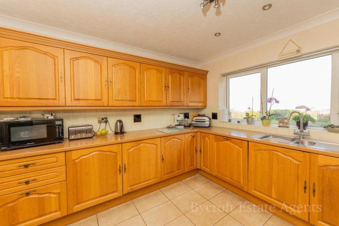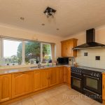 KITCHEN/BREAKFAST ROOM 11' 10" x 10' 10" (3.61m x 3.3m) fitted with a range of medium oak fronted units comprising cupboards and drawers with wood effect worksurface over; matching range of wall units with under surface lighting; integrated fridge and freezer; single drainer one and a half bowl sink unit with mixer tap and water softener; part tiled walls; recess with Rangemaster LPG gas cooker; double extractor hood over; radiator; double glazed picture window to front providing distant sea views; tiled flooring.
