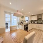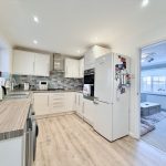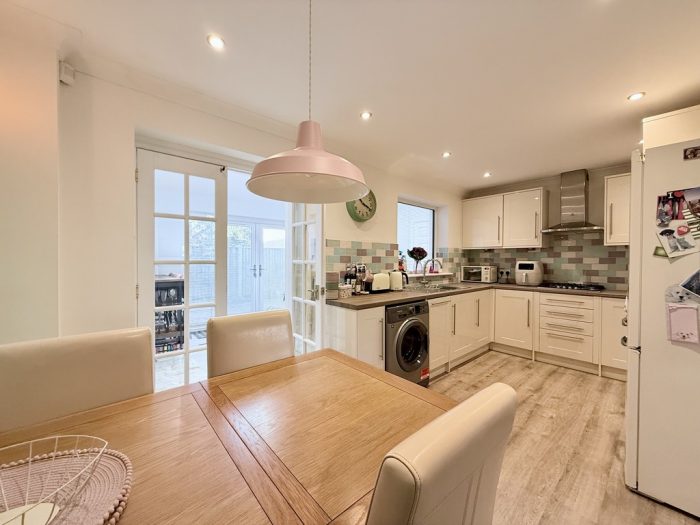 KITCHEN/DINER 16' 6" x 8' 8" (5.03m x 2.64m) plus deep under stairs storage cupboard; u-shaped worktop; range of base cupboards and drawers; including integrated slimline dish washer; space and plumbing for washing machine; built in eye level Zanussi oven and grill; matching four ring gas hob; one and a half bowl sink with mixer tap; space for upright fridge freezer; range of wall units; light and extractor; radiator; down lights; window and double doors into: