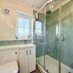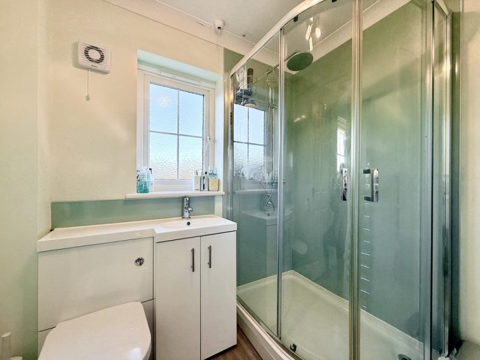 SHOWER ROOM vanity unit comprising; wc with push button cistern; wash hand basin with mixer tap; double cupboard under; shower cubicle with mains fittings and two shower heads; chrome heated towel rail; extractor fan.