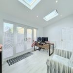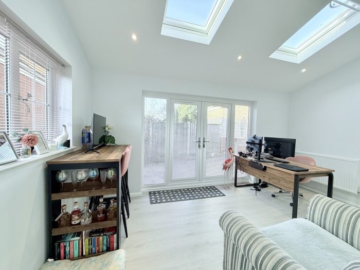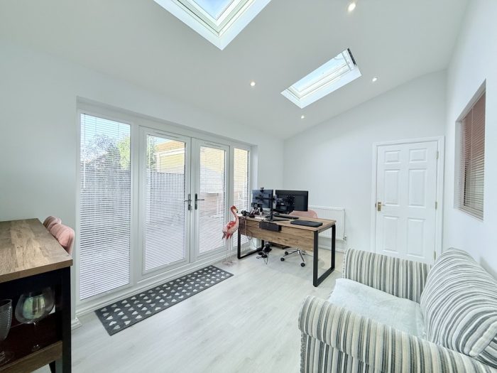 GARDEN ROOM 15' 2" x 8' 11" (4.62m x 2.72m) French doors with fixed side panels to the garden; further side window; sloping ceiling with two Velux roof lights; down lights; radiator; door to: