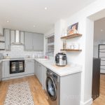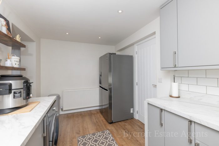 KITCHEN/BREAKFAST ROOM 14' 7" x 7' 9" (4.44m x 2.36m) recently fitted kitchen; large u-shaped worktop; range of base cupboards and drawers; including integrated slimline dish washer; built in oven with four ring hob; space and plumbing for washing machine; resin one bowl sink with mixer tap; range of wall units; light and extractor; space for American style fridge freezer; radiator; window to rear aspect; down lights; large opening through to: