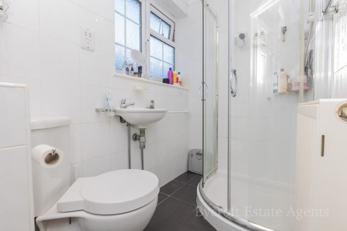 BATHROOM bath with mixer tap; mains shower fittings; shower screen; wc with push button cistern; pedestal wash hand basin with mixer tap; fully tiled walls; frosted double glazed window; radiator; extractor fan.
