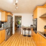 KITCHEN 12' 7" x 10' 4" (3.84m x 3.15m) I-shaped worktop with base cupboards under; space and plumbing for dishwasher and washing machine; space for upright fridge freezer; stainless steel bowl and a half sink with mixer tap; further I-shaped worktop/breakfast bar with cupboards and drawers under; built in eye level Hotpoint oven and grill; Belling four ring hob; range of wall units; light and extractor; side window; radiator; door off the kitchen into: