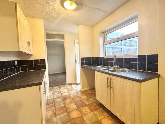 KITCHEN 7' 6" x 7' (2.29m x 2.13m) comprising wall and base units; space for washing machine; space for free standing cooker; one and a half bowl sink; upvc double glazed window to rear aspect.