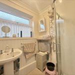 SHOWER ROOM 5' 6" x 5' 10" (1.68m x 1.78m) UPVC double-glazed window to side; fitted with white suite comprising pedestal hand wash basin, corner quadrant shower cubicle with aqua board wall coverings and decorative panelled splashbacks, shower sliding screen doors and wall mounted shower unit.