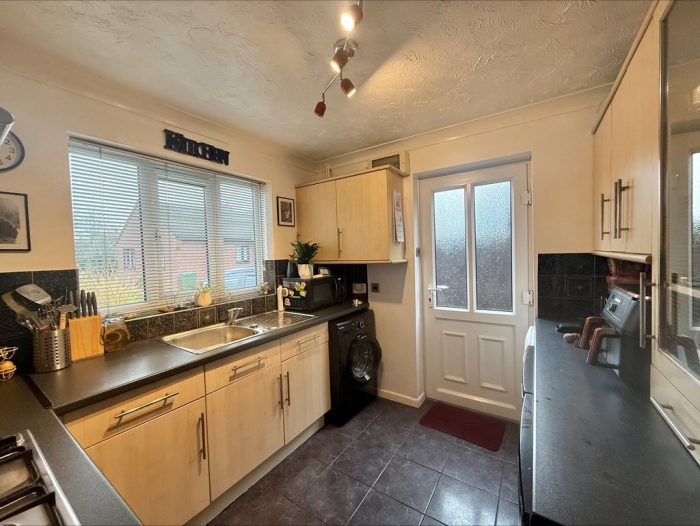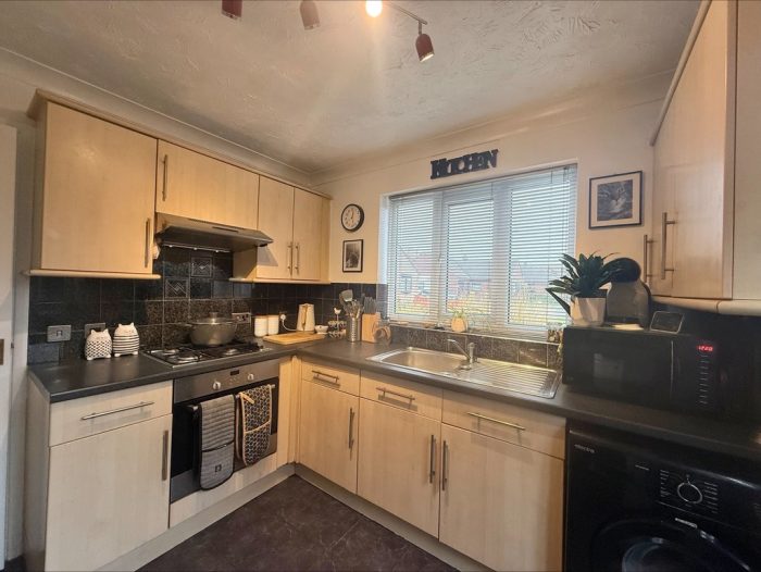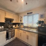 KITCHEN 9' 1" x 8' 5" (2.77m x 2.57m) fitted with a range of wall and base units; inset stainless steel single drainer sink with mixer tap; inset electric oven and inset gas hob with cooker hood over; tiled splashbacks; plumbing for automatic washing machine and dishwasher; space for fridge freezer; tiled flooring; UPVC double glazed door to side; UPVC double glazed window to front.