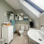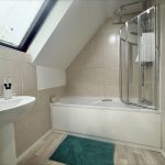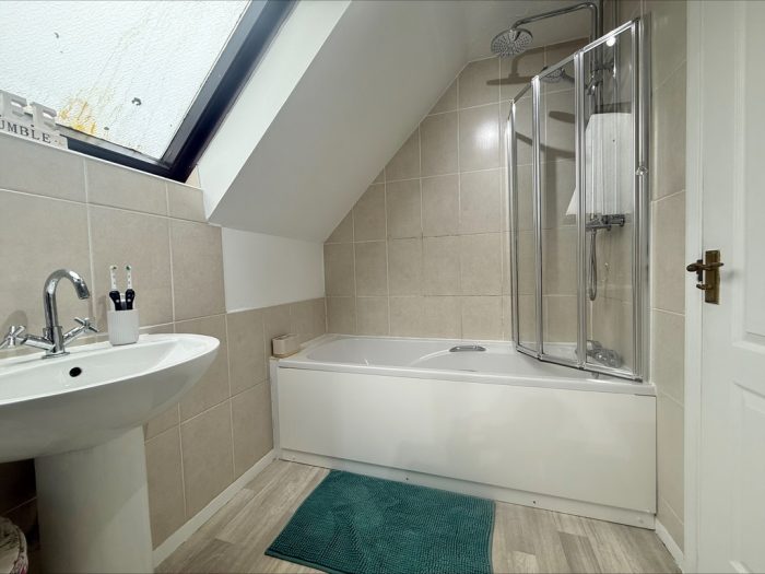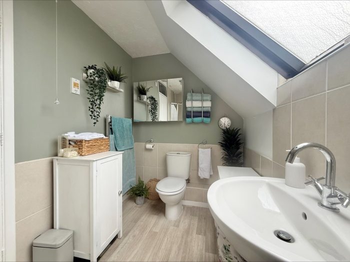 BATHROOM 10' 6" x 5' 9" (3.2m x 1.75m) fitted with a white suite comprising of a low level wc; pedestal wash hand basin with mixer tap; panelled bath with mixer tap, shower screen and wall mounted shower attachment over; tiled splashbacks; heated towel rail radiator; Velux window to rear.