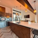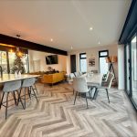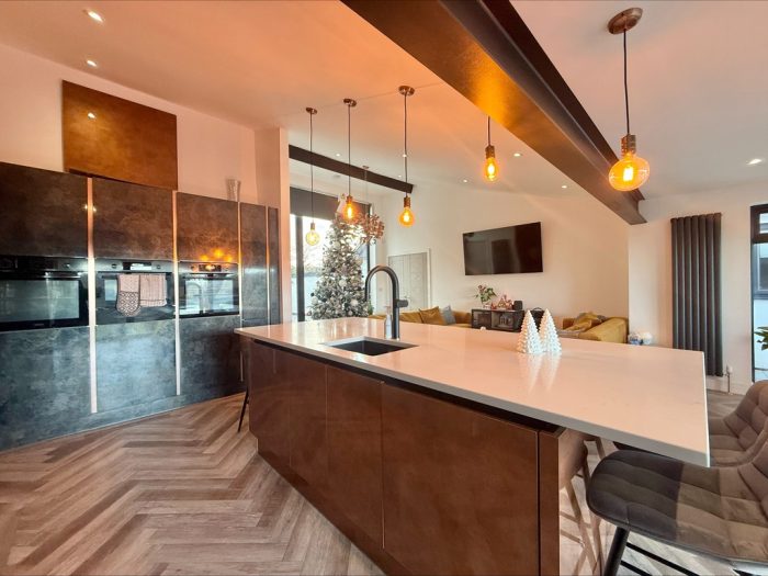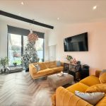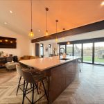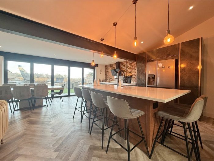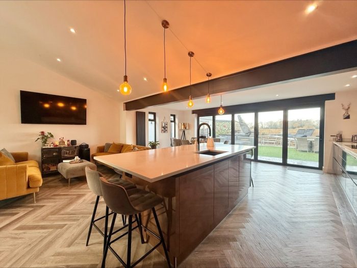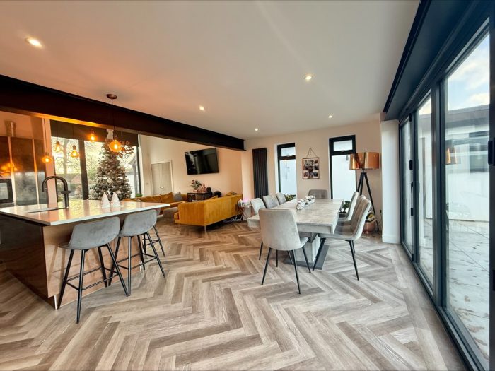 OPEN PLAN LIVING AREA 26' 8 max" x 21' 8 max" (8.13m x 6.6m) UPVC double-glazed full height windows to the front and side; double bi-folding doors to rear; sitting and dining areas fitted with a range of wall and base units with granite work surfaces over; inset five ring Bosch induction hob with cooker hood over; space for American style fridge freezer; bank of ovens including 2 fan ovens and 1 microwave; central island unit with inset sink, bin drawer and integrated dishwasher.